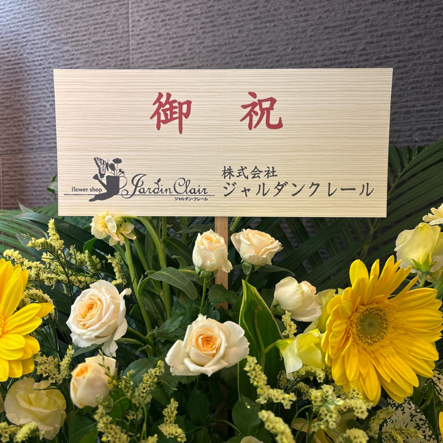 - はい。「祝 開店」「祝 御就任」など、ご用途に合わせた文言で立札をお付けできます。法人名・個人名の表記やレイアウトもご希望に応じて対応いたします。