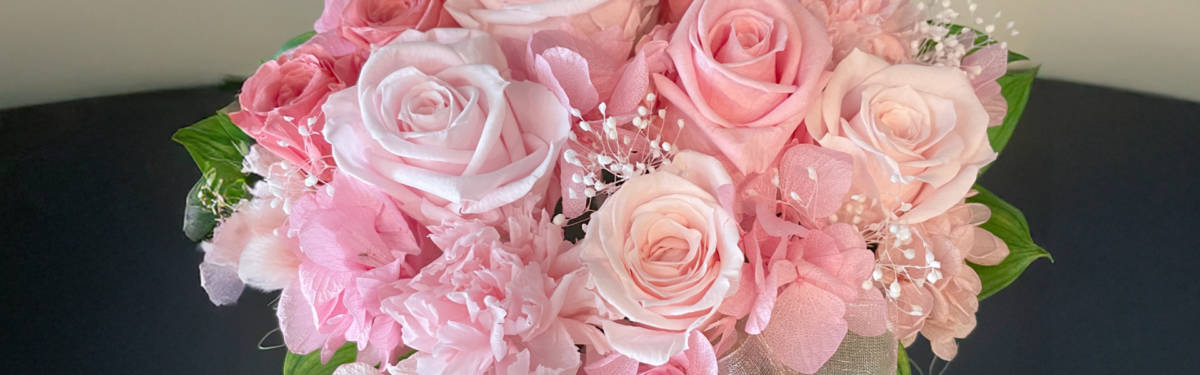 プリザーブドフラワーは、生花を一番美しい状態で特殊加工し、瑞々しい質感や色合いを長期間保てるようにしたお花です。